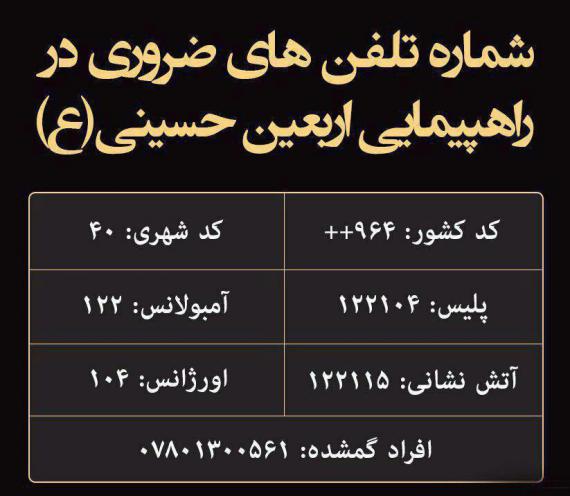 شماره تلفنهای ضروری در راهپیمایی اربعین حسینی به شرح ذیل است: