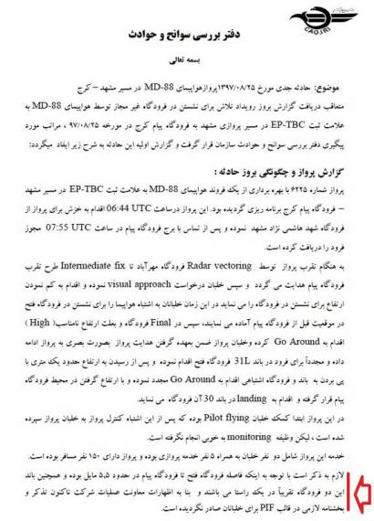 موضوع: حادثه جدی مورخ ۲۵/۰۸/۹۷ پروازهواپیمای MD-۸۸ در مسیر کرج – مشهد