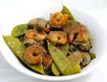 یک ماهیتابه یا ووک برداشته و روغن را روی حرارت متوسط گرم کنید. قارچ را داخل ووک ریخته و تفت دهید، تا زمانی که آب آن تبخیر شده و به رنگ قهوه ای در بیایند (۶ تا ۱۰ دقیقه). غلاف نخود فرنگی را اضافه کرده و دو دقیقه دیگر تفت دهید تا ترد شوند. پیازچه را هم اضافه کرده و سی ثانیه دیگر سرخ کنید. حالا مخلوط عصاره مرغ را اضافه کرده و تا زمانی که میگو تیره رنگ و سس غلیظ نشده به سرخ کردن ادامه دهید (حدود یک دقیقه). حالا با نمک و فلفل آن را چاشنی زده و اگر دوست داشتید با برنج سرو کنید.
